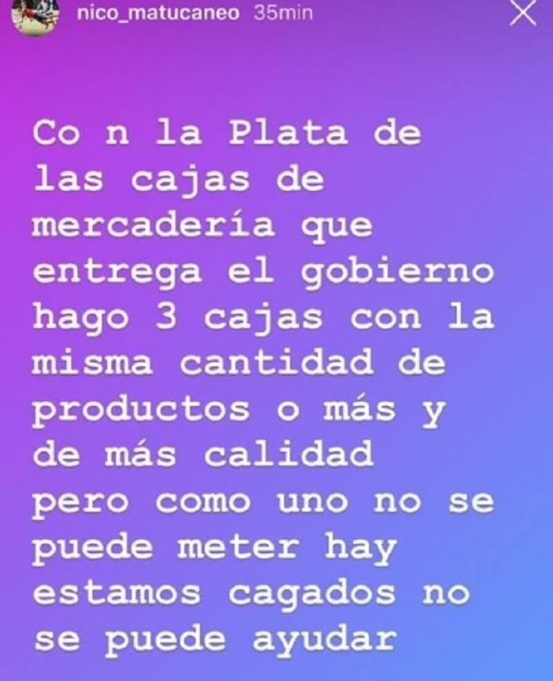 "Con esa plata de las cajas de mercadería que entrega el gobierno hago 3 cajas con la misma cantidad de productos o más y de más calidad, pero como uno no se puede meter ahí estamos cagados, no se puede ayudar", escribió el zurdo en una historia de Instagram.