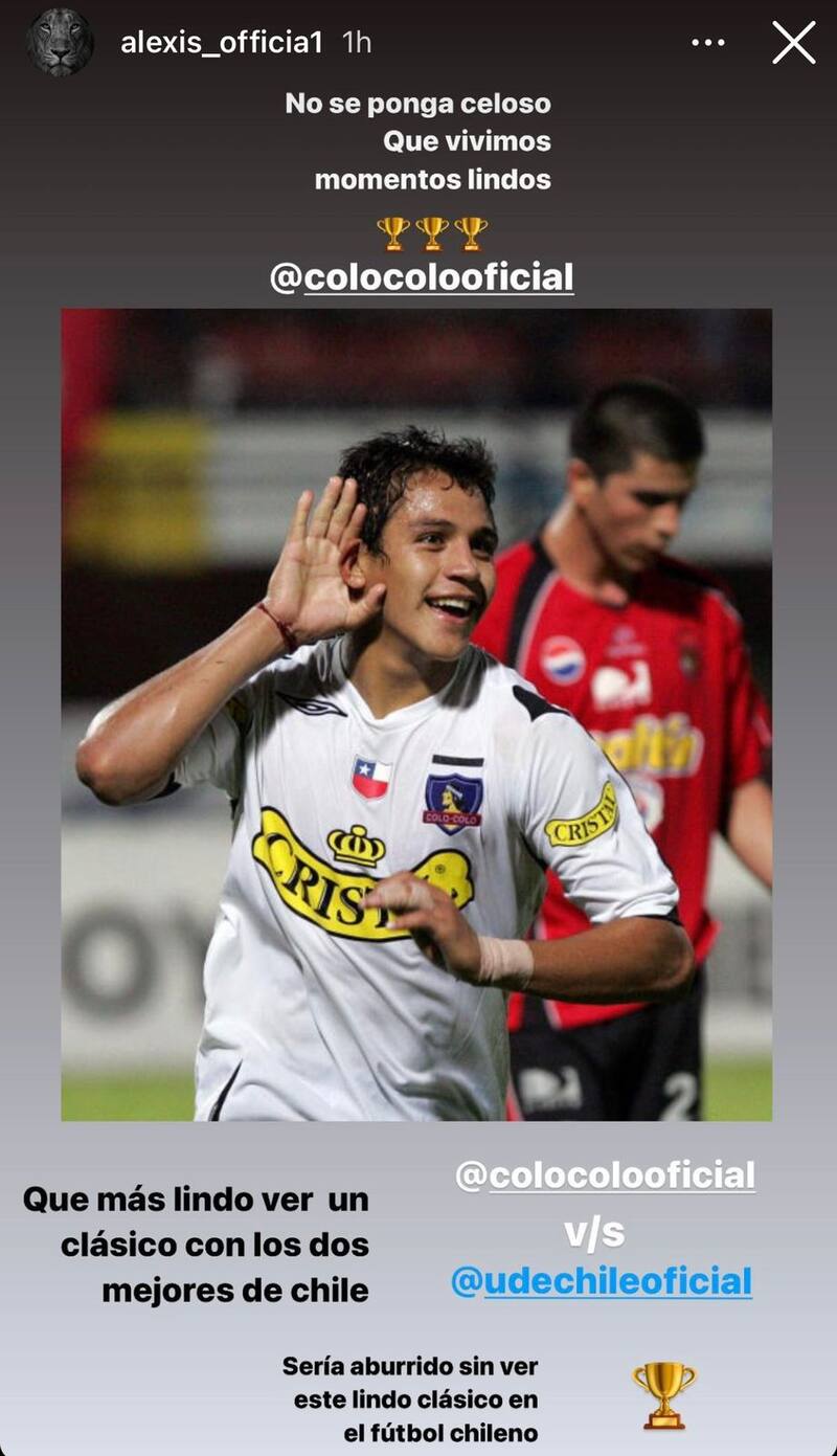 Por lo mismo, varios hinchas albos se pusieron sentimentales al ver la alegría del tocopillano por la remontada del archirrival. Así lo dejó ver el propio Alexis, quien compartió una nueva historia en Instagram este lunes, con la camiseta de Colo Colo, para “aclarar” sus mensajes.