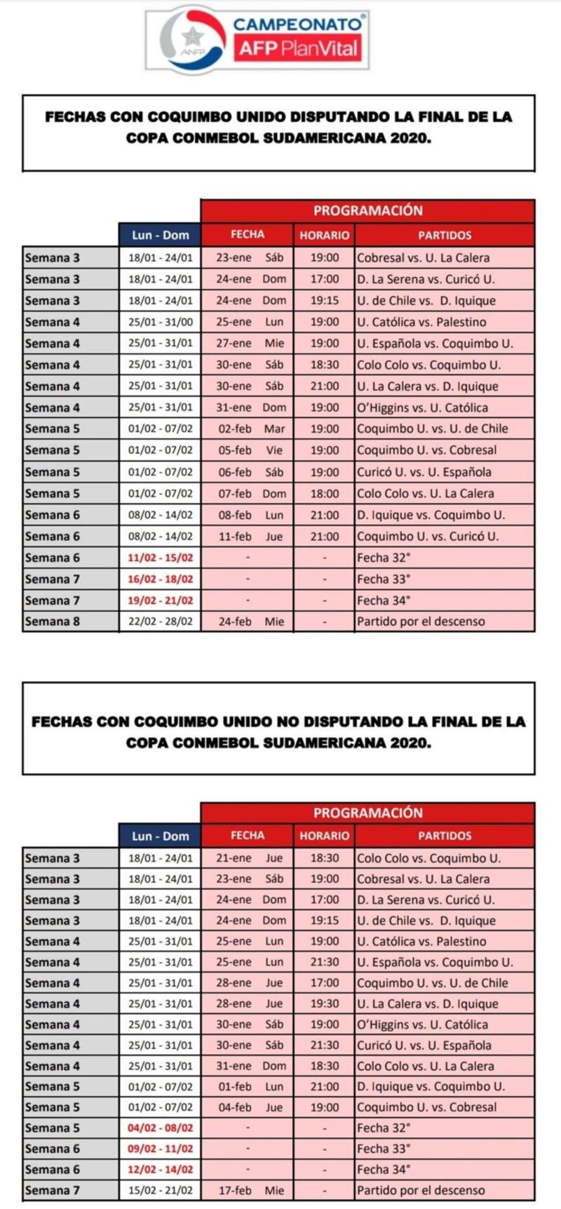 El calendario fue confeccionado tomando en cuenta si Coquimbo Unido es eliminado o jugando la final de la Copa Sudamericana.