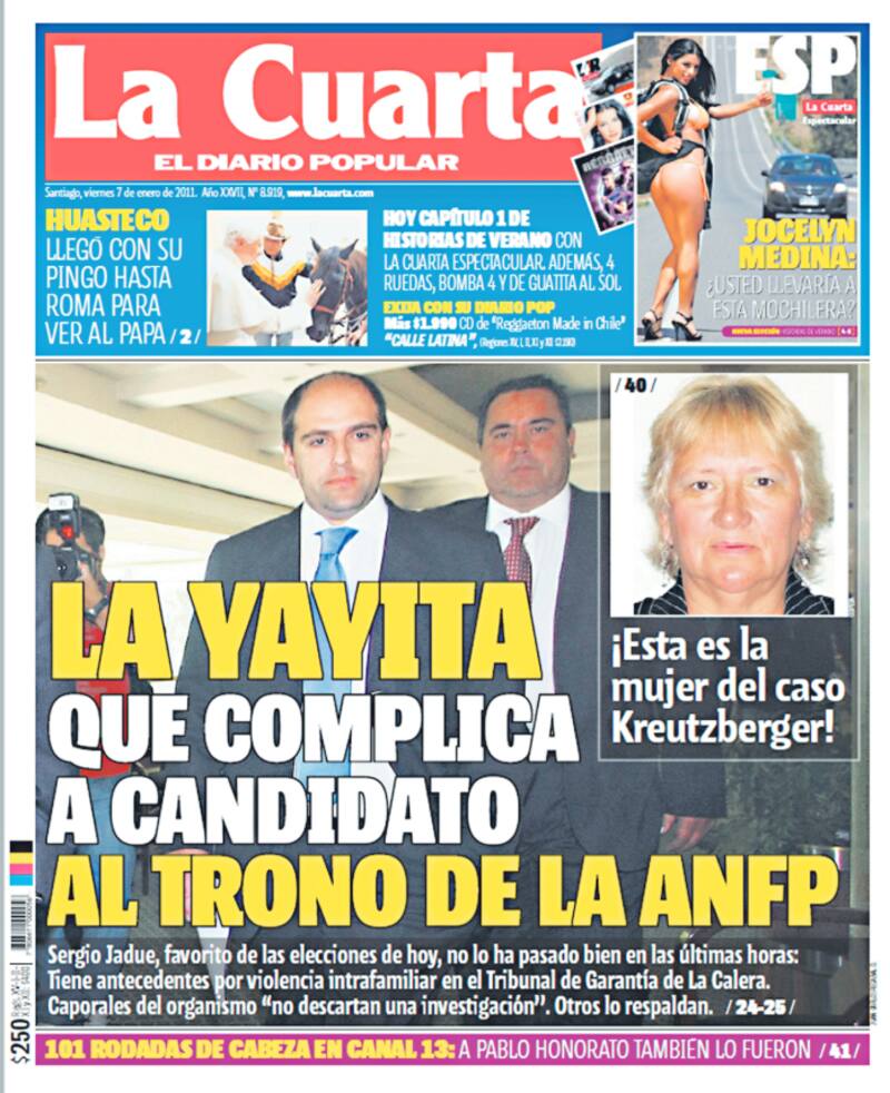 Justo antes de la elección del nuevo presidente de la ANFP en enero del 2011, una publicación de La Cuarta "incendió" el proceso y puso en tela de juicio la idoneidad moral de Sergio Jadue, debido a que fue formalizado en el Tribunal de Garantía de La Calera por lesiones menos graves en el contexto de violencia intrafamiliar contra su esposa.