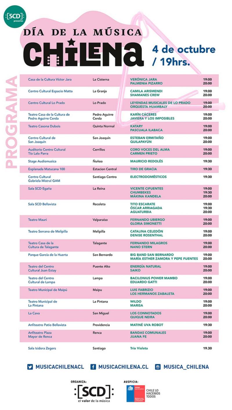Con 50 actividades en todas las regiones del país se celebra hoy jueves 4 de octubre el "Día de la Música Chilena", que contempla 40 conciertos simultáneos en distintas comunas de Santiago.