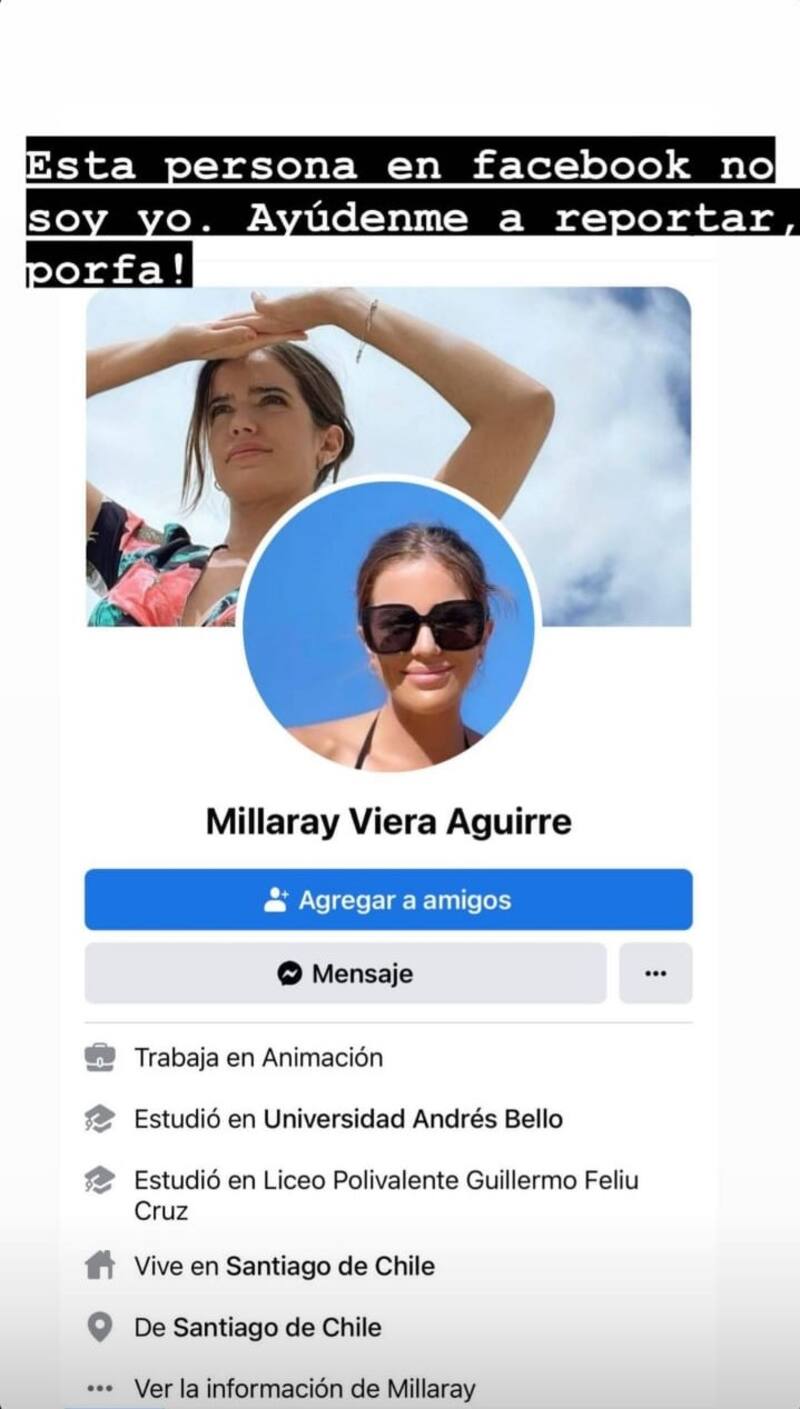 Millaray Viera contó a través de una storie en su perfil de Instagram, que existe una cuenta en Facebook que se hace pasar por ella. Para evitar al máximo cualquier problema que se pudiera presentar por esta situación, la conductora de Sabingo pidió ayuda a sus más de 706.000 seguidores.