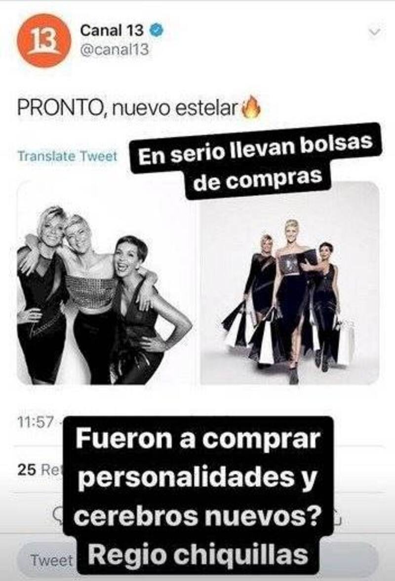 Por esta razón, Canal 13 también anunció su nuevo espacio, con las fotografías del trío, en su cuenta de Twitter, la que fue vista por Jani Dueñas, quien no dudó en dar su opinión.