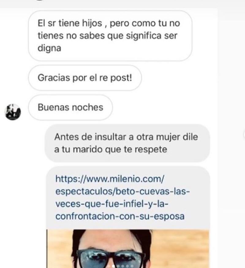 "El sr tiene hijos, pero como tú no tienes no sabes que significa ser digna. Gracias por el repost! Buenas noches", le escribió en su cuenta de Instagram.