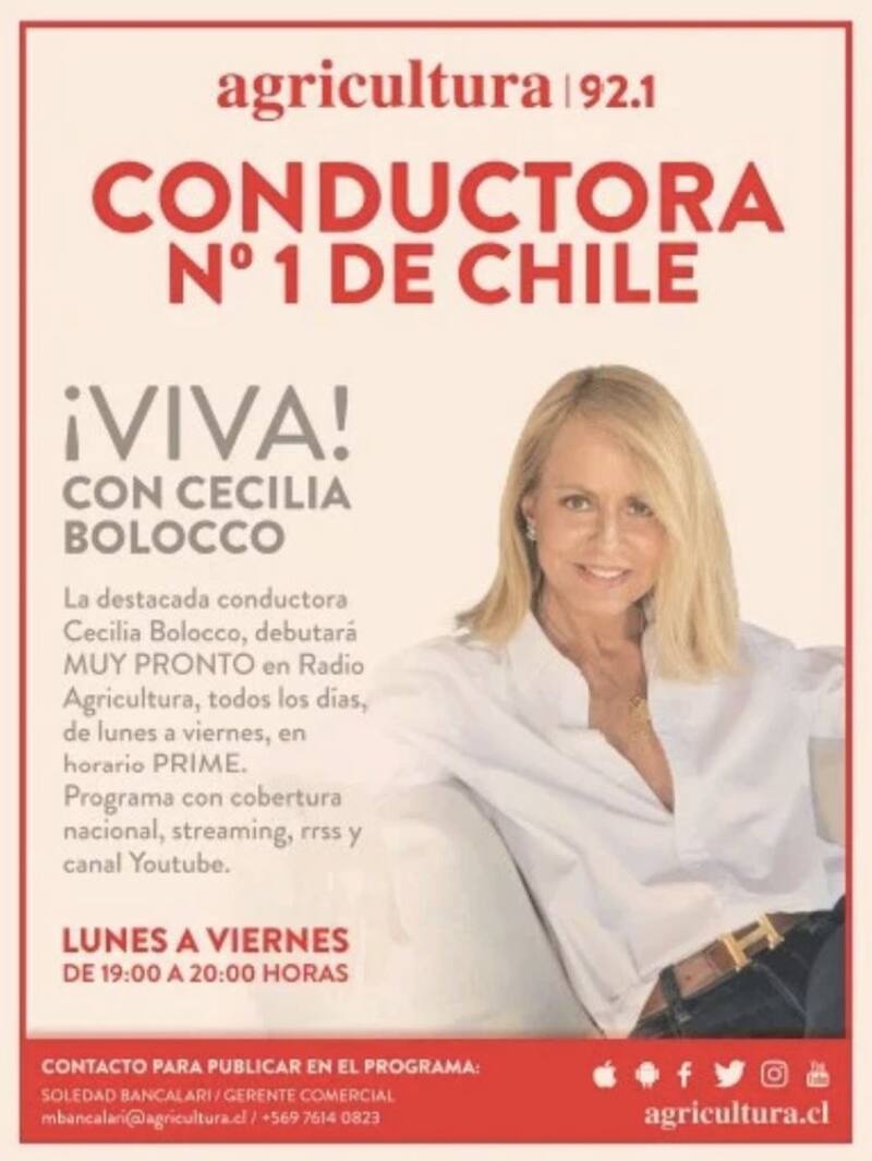 La ex Miss Universo, Cecilia Bolocco, regresa a los medios de comunicación con un nuevo programa radial llamado "¡Viva! con Cecilia Bolocco", el cual será emitido por Radio Agricultura, así se dio a conocer a través de una publicidad en la web.