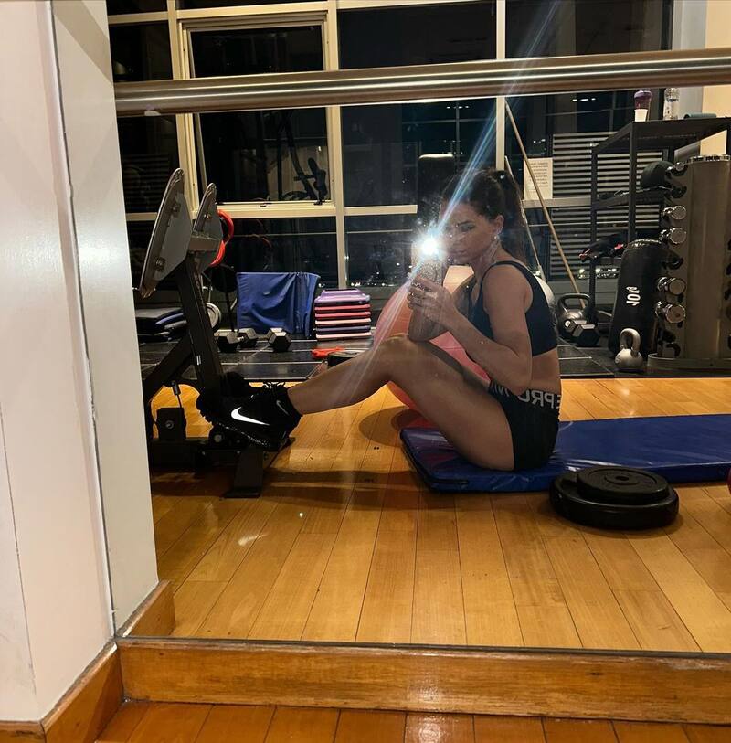 La actriz trasandina posó con ropa deportiva frente al espejo y en diversas posiciones.