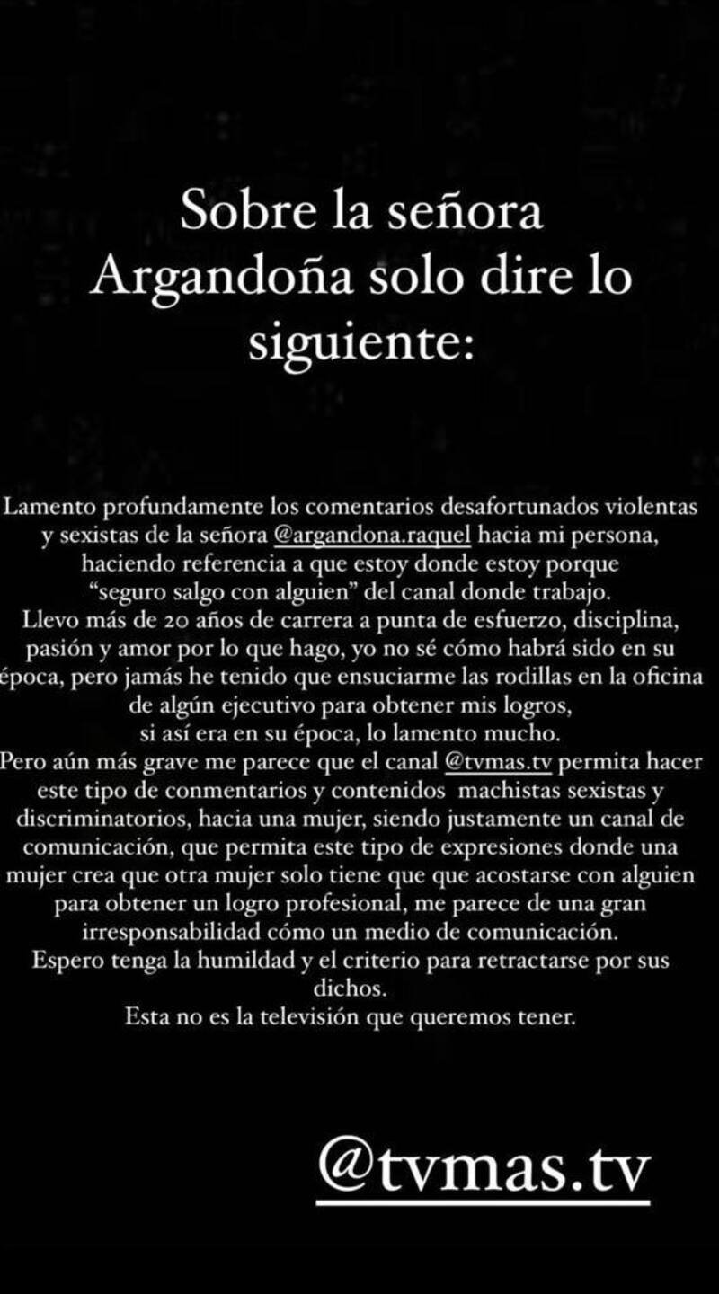 “Lamento profundamente los comentarios desafortunados, violentos y sexistas de la señora Raquel Argandoña hacia mi persona. Haciendo referencia a que estoy donde estoy porque ‘aseguró que salgo con alguien’ del canal donde trabajo”, partió diciendo en la publicación.