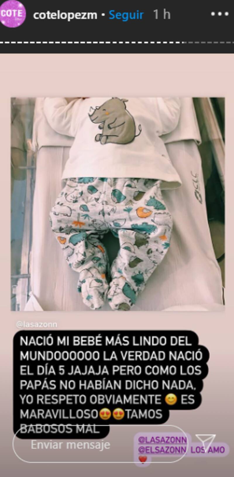 "Nació mi bebé más lindo mundooooo. La verdad nació el día 5 jajaja pero como los papás no habían dicho nada, yo respeto obviamente. Es maravilloso. Tamos babosos mal", escribió la modelo.