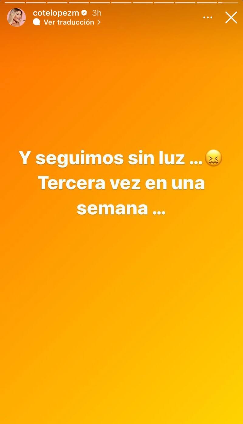 “Y seguimos sin luz... Tercera vez en una semana”, expresó López en sus plataformas digitales, dejando en claro que siguen las complejidades en esta materia.