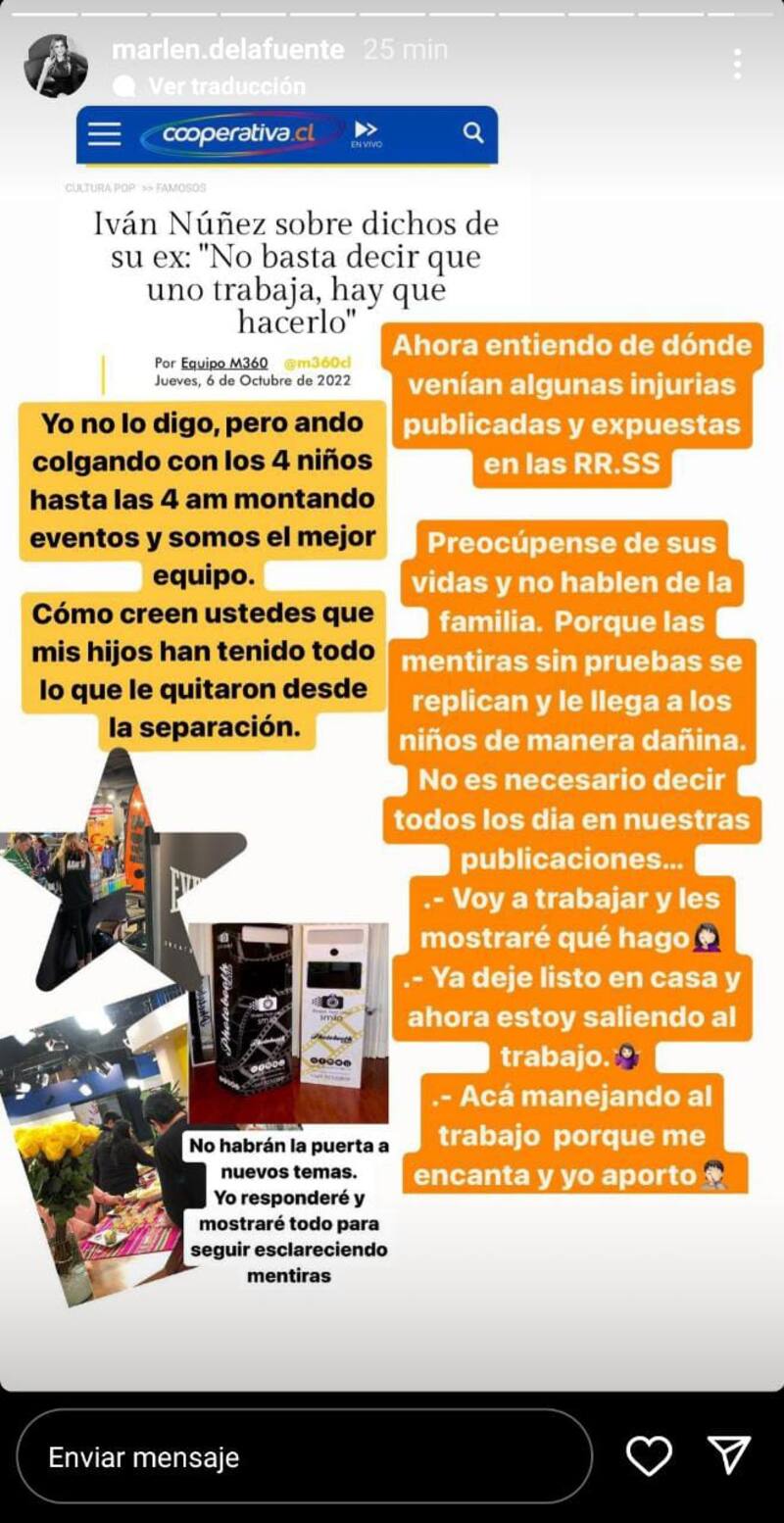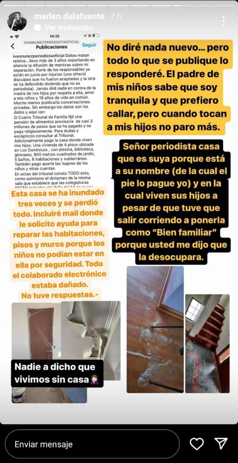 La periodista y ex esposa de Iván Núñez, Marlene de la Fuente utilizó sus redes sociales para responder a los dichos del comunicador quien desmintió sus acusaciones de deuda de pensiones, infidelidad, entre otras cosas.