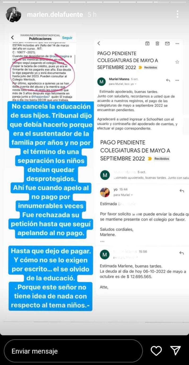 “Hasta que dejó de pagar. Y cómo no se lo exigen por escrito… el se olvidó de la educación. Porque este señor no tiene idea de nada con respecto al tema de los niños”, afirmó compartiendo pantallazos de correos con personal de la escuela de sus hijos quienes le mencionan la deuda que deberían en el recinto.