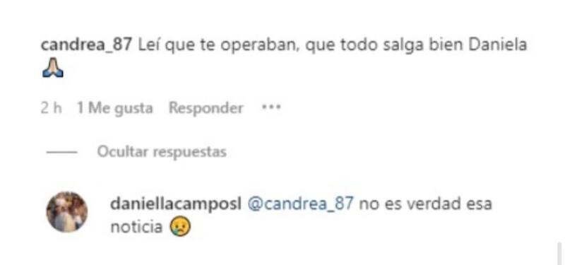 "Leí que te operaban, que todo salga bien Daniella", escribió la seguidora, lo cual fue respondido de forma inmediata por la ex figura televisiva.