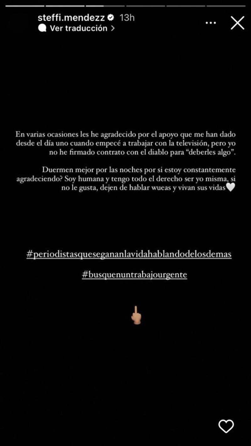 A través de sus historias de Instagram, Steffi Méndez lanzó una dura crítica a los periodistas de farándula que hablan de ella.