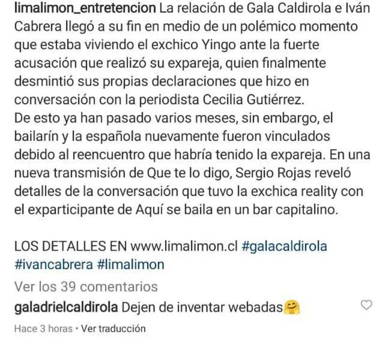 La ex chica reality Gala Caldirola compartió su molestia en la web luego de que se viralizara recientemente un supuesto reencuentro que tuvo con su ex pareja, el ex chico Yingo Iván Cabrera.