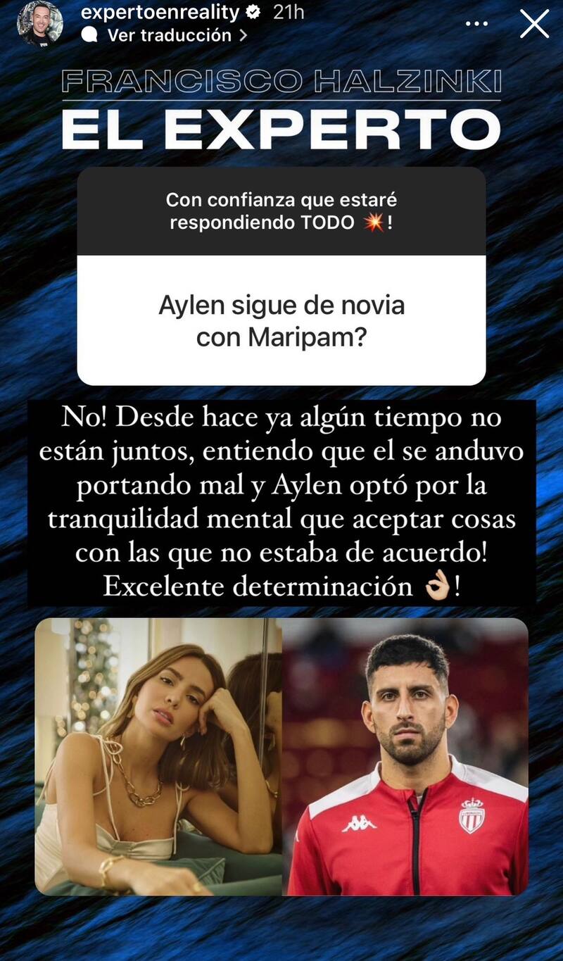 El ex panelista del Me Late respondió a una consulta que le hicieron en Instagram sobre los tortolitos. “¿Aylén sigue de novia con Maripán?”, le preguntaron.
