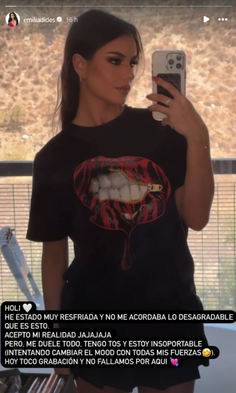 A través de una historia publicada en la red social, Emilia señaló “Holi, he estado muy resfriada y no me acordaba de lo desagradable que es esto. Acepto mi realidad JAJAJAJA Pero me duele todo, tengo tos y estoy insoportable. (Intentando cambiar el mood con todas mis fuerzas)”.