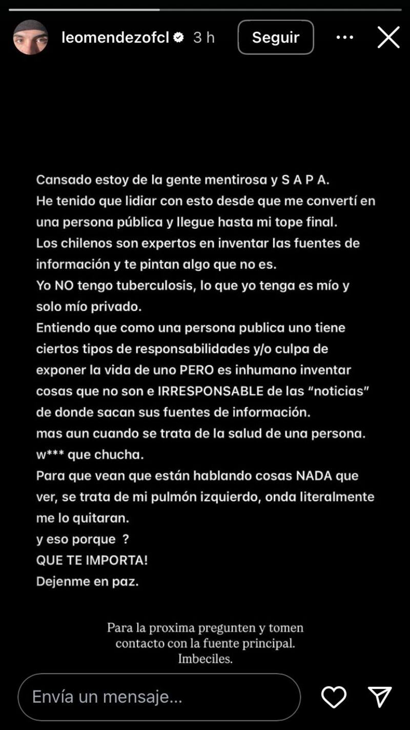 Ante esto, Leo alzó la voz y compartió un furioso mensaje, revelando cuál es su verdadero estado de salud.
