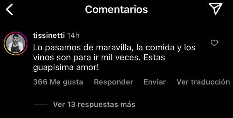 “Lo pasamos de maravilla, la comida y los vinos son para ir mil veces. ¡Estas guapisima amor!”, escribió Tissinetti, recibiendo varios comentarios de los fans de Kel.