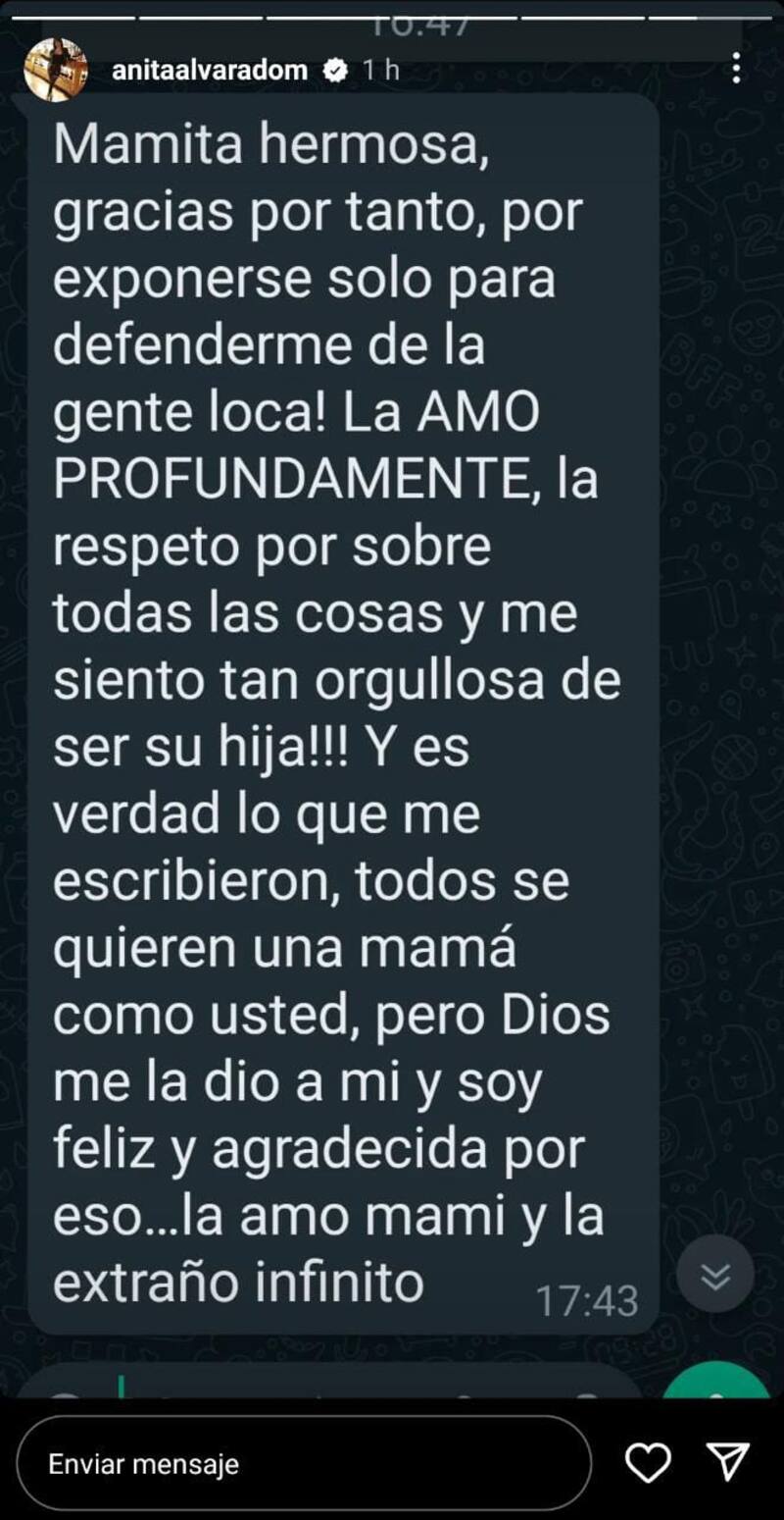 “Y es verdad lo que me escribieron, todos quieren una mamá como usted, pero Dios me la dio a mi y soy feliz y agradecida por eso… la amo mami y la extraño infinito”, agregó la influencer en el mensaje para Anita Alvarado quien lo compartió con mucho orgullo.