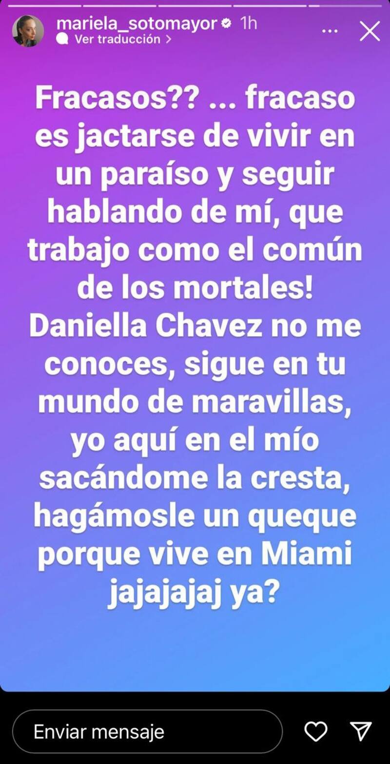 “Fracasos???... fracaso es jactarse de vivir en un paraíso y seguir hablando de mí, que trabajo como el común de los mortales! Daniella Chávez no me conoces, sigue en tu mundo de maravillas, yo aquí en el mío sacándome la cresta, hagámosle un queque porque vive en Miami jajajaja ya?”, agregó generando diversas reacciones.