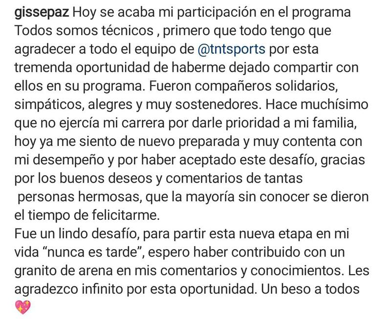 “Hoy se acaba mi participación en el programa Todos somos técnicos, primero que todo tengo que agradecer a todo el equipo de @tntsports por esta tremenda oportunidad de haberme dejado compartir con ellos en su programa. Fueron compañeros solidarios, simpáticos, alegres y muy sostenedores”, señaló.