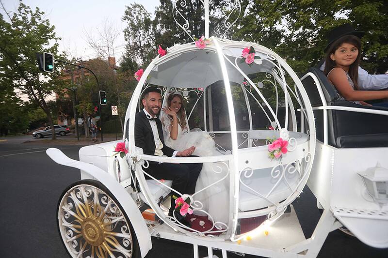 La novia llegó en un carruaje blanco a motor, estilo Cenicienta, pero sin ratones, acompañada por su papá. Con una sonrisa de oreja a oreja, Gala caminó por la alfombra rumbo al altar, donde ya la esperaba el Huaso de negro.