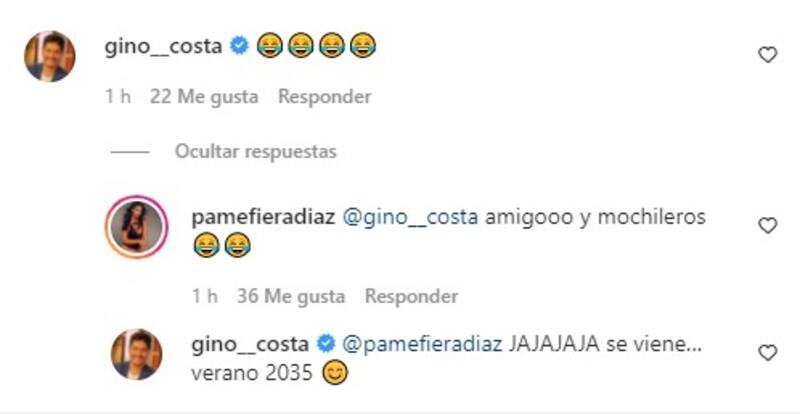 Gino Costa le comentó emojis de risa, a lo que la Fiera le preguntó por el show. “Amigo y ¿Mochileros?”, le consultó Díaz a lo que el periodista respondió “JAJAJAJA, se viene… verano 2035″, provocando risas de sus seguidores.