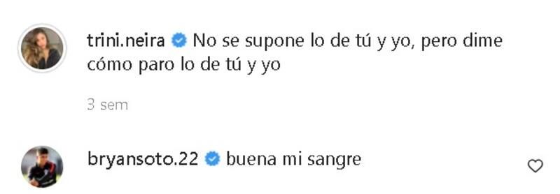 En una de sus publicaciones Trinidad escribió “yo te quiero pa mi na ma”, mensaje que el mediocampista en Deportes La Serena, Bryan Soto, respondió con un corazón negro.