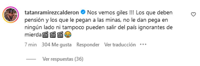 Ramírez, en tanto, no se quedó callado y respondió a las críticas en la sección de comentarios de un post de Instagram del programa. “Nos vemos giles!!! Los que deben pensión y los que le pegan a las minas, no les dan pega en ningún lado ni tampoco pueden salir del país”, sentenció.