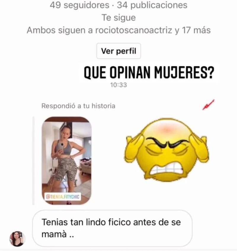 Sin embargo, una de sus seguidores cuestionó su apariencia. “Tenías tan lindo ficico (sic) antes de ser mamá”, le comentó una joven, quien generó la molestia inicial de la artista. “¿Qué opinan mujeres?”, planteó la aludida.