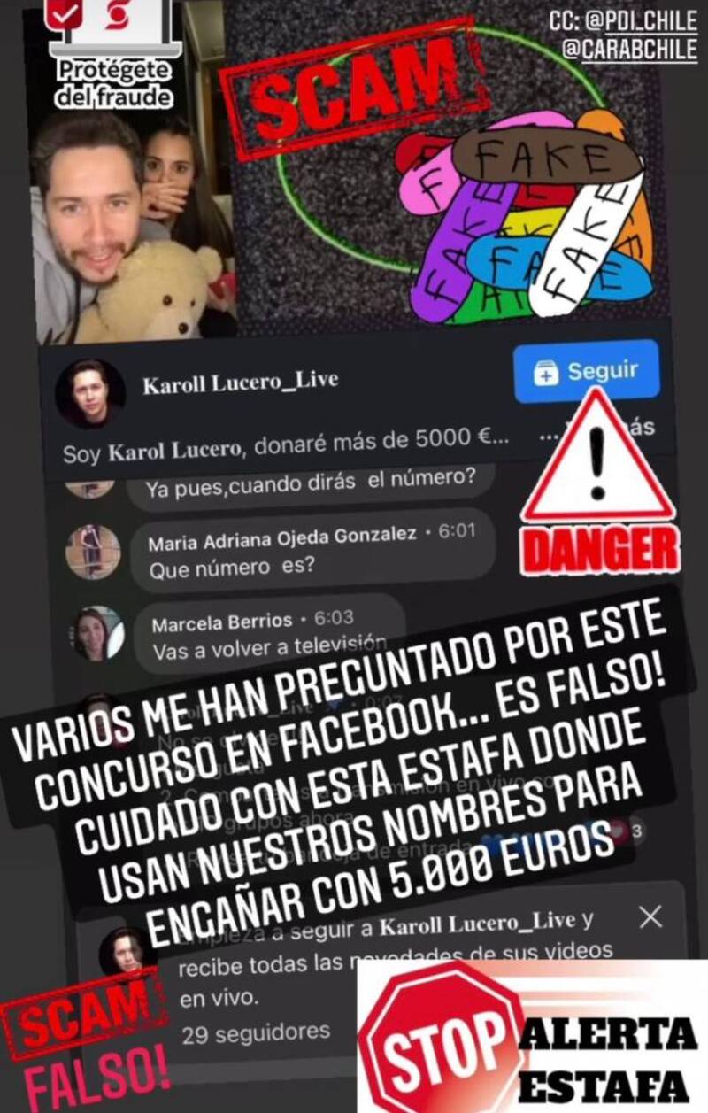 "Varios me han preguntado por este concurso en Facebook. Es falso. Cuidado con esta estafa donde usan nuestros nombres para engañar con 5 mil euros", escribió en sus historias de Instagram.