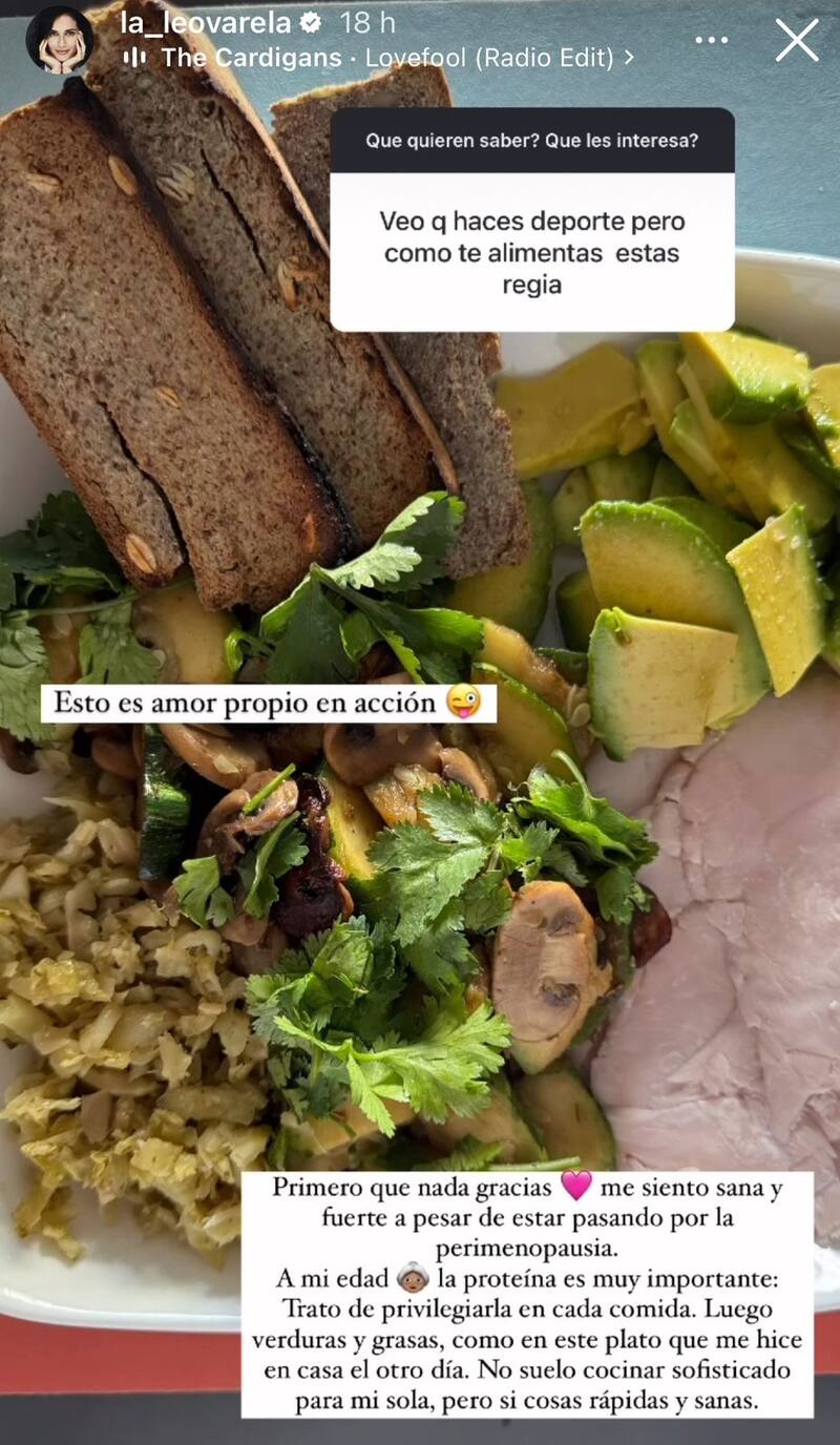 Además, Leonor admitió que a su edad, “la proteína es muy importante. Trato de privilegiarla en cada comida. Luego verduras y grasas, como en este plato que me hice en casa. No suelo cocinar sofisticado para mí sola, sí cosas rápidas y sanas”.