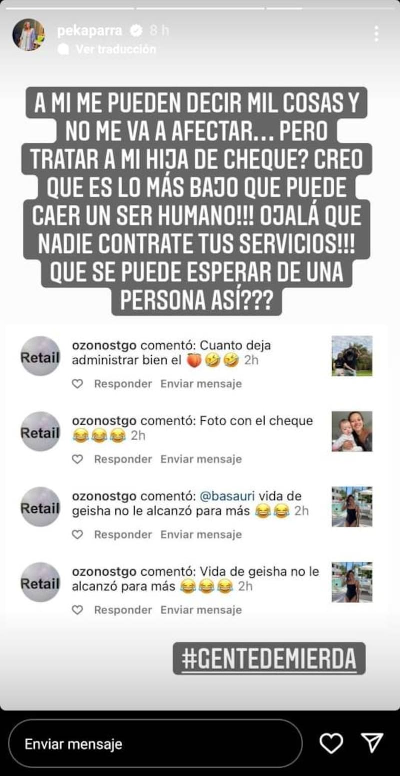 “A mi me pueden decir mil cosas y no me va afectar… pero tratar a mi hija de cheque? Creo que es lo más bajo que puede caer un ser humano!!! Ojalá que nadie contrate tus servicios!!! Que se puede esperar de una persona así??? Gente de mier…”, agregó en otro registro dejando en evidencia su molestia.