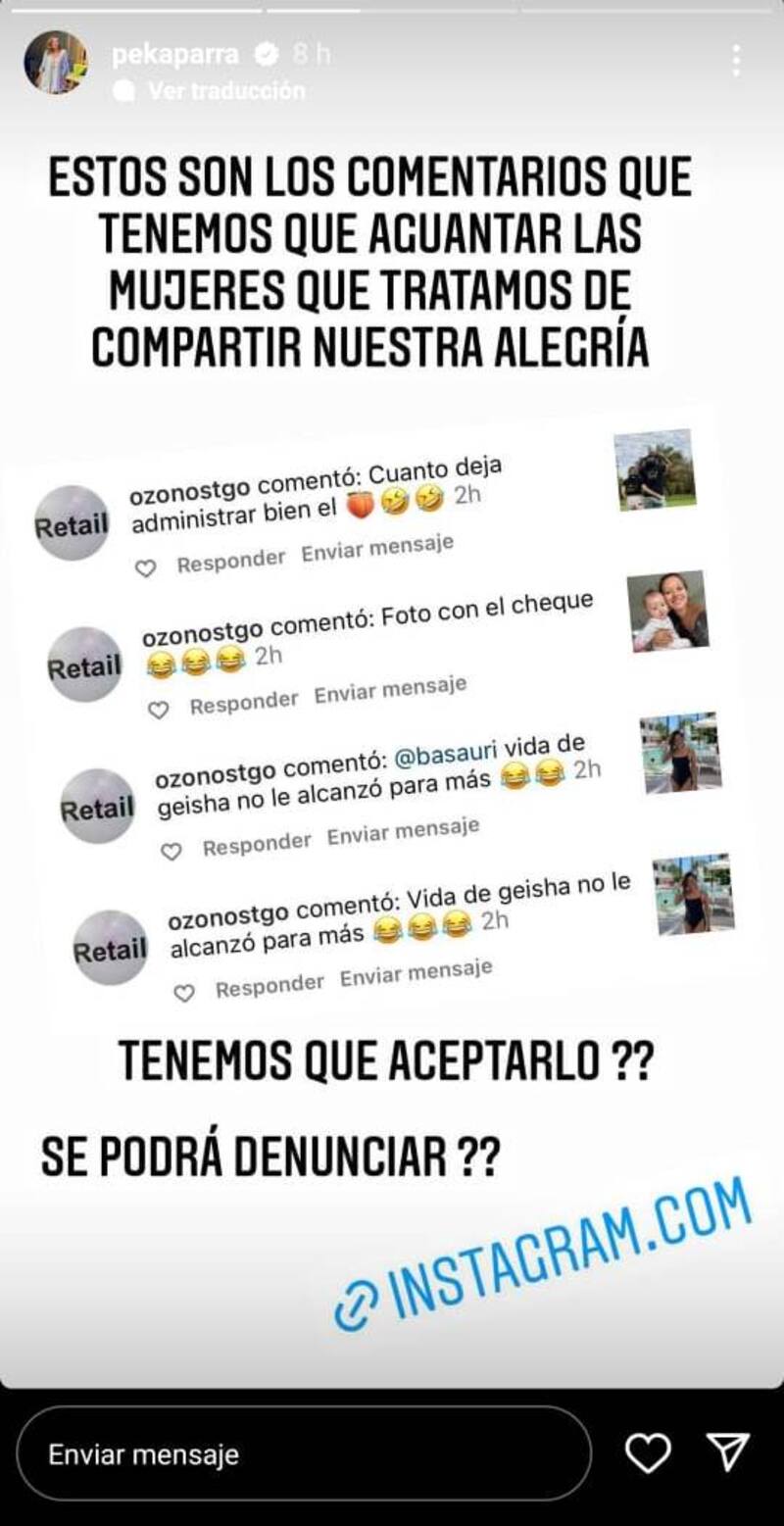 “Estos son los comentarios que tenemos que aguantar las mujeres que tratamos de compartir nuestra alegría. Tenemos que aceptarlo?? Se podrá denunciar”, detalló en una historia.