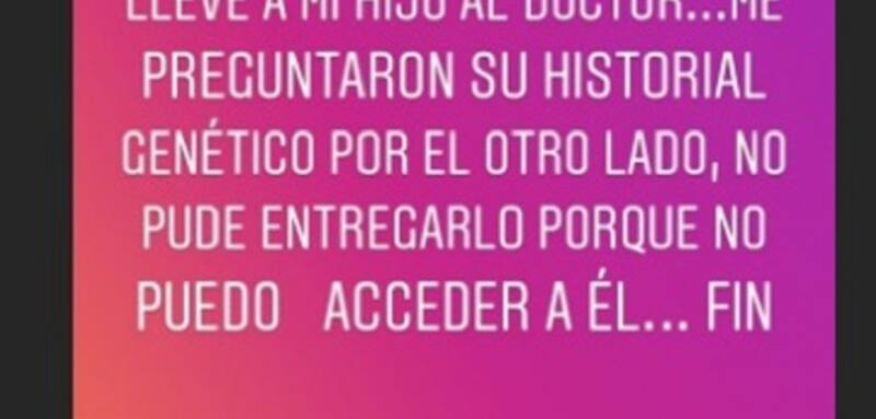"Llevé a mi hijo al doctor. Me preguntaron su historial genético por el otro lado, no pude entregarlo porque no puedo a acceder a él. Fin", indicó Lasen en su Instagram.