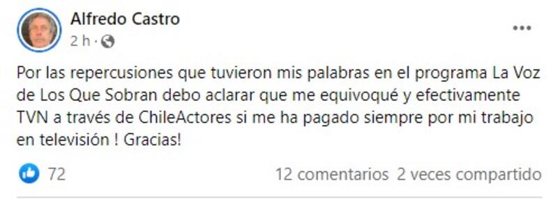 “Por las repercusiones que tuvieron mis palabras en el programa La Voz de los que Sobran, debo aclarar que me equivoqué y efectivamente Chileactores me ha pagado siempre por mi trabajo en televisión”, detalló Alfredo Castro en sus redes sociales, buscando poner fin a la polémica.