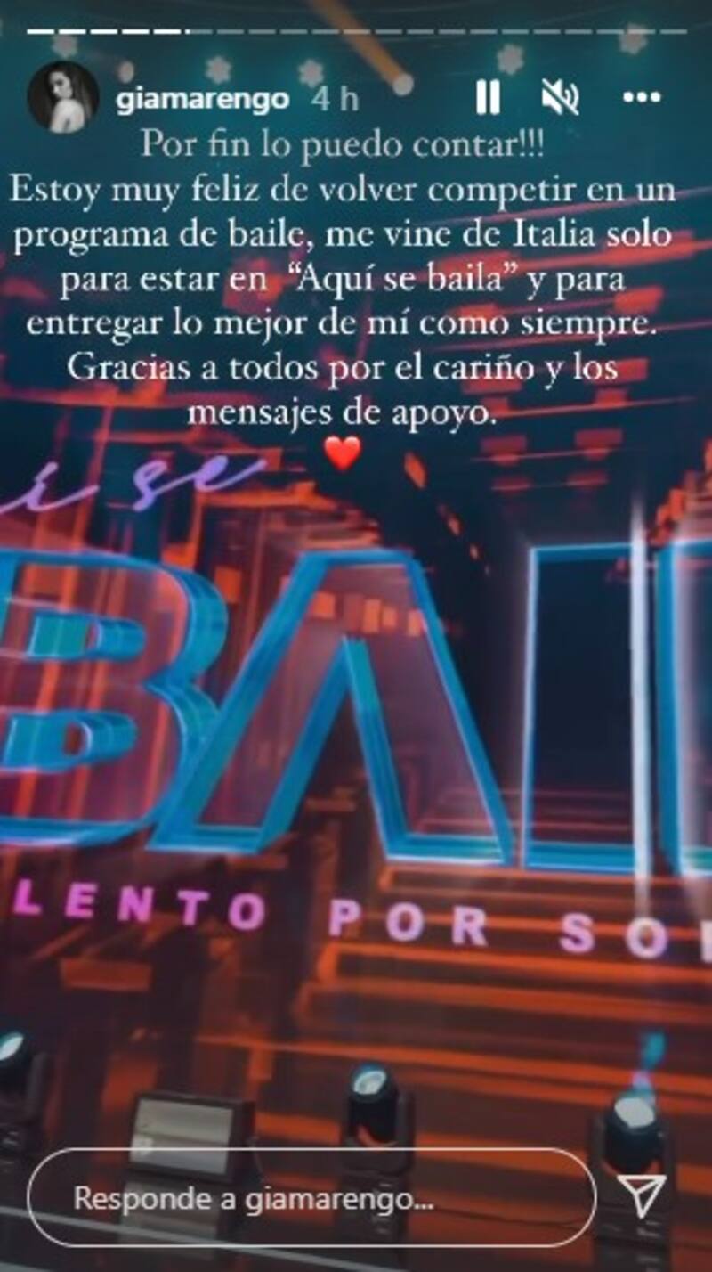 “Por fin lo puedo contar!!! Estoy muy feliz de volver a competir en un programa de baile, me vine de Italia solo para estar en ‘Aquí se baila’ y para entregar lo mejor de mí como siempre”, detalló en las historias de la red social.