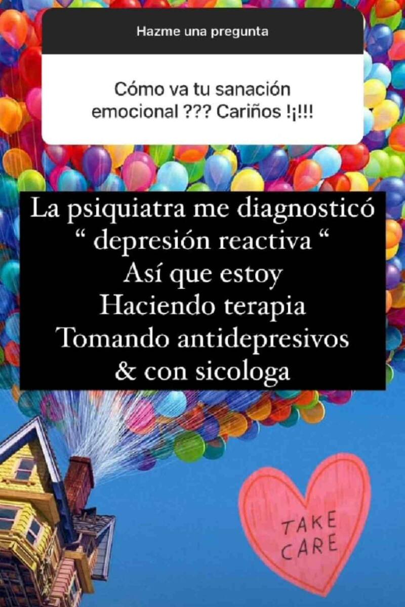 “La psiquiatra me diagnosticó ‘depresión reactiva’, así que estoy haciendo terapia, tomando antidepresivos y con psicóloga”, reveló la exintegrante de Pareja Perfecta.
