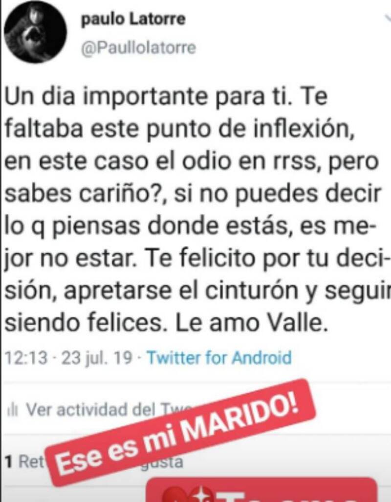 Ante este escenario, fue el marido de Ale Valle, Paulo Latorre, quien le prestó ropa a su esposa a través de las redes sociales. Un dia importante para ti. Te faltaba este punto de inflexión, en este caso el odio en rrss", comentó en Twitter.