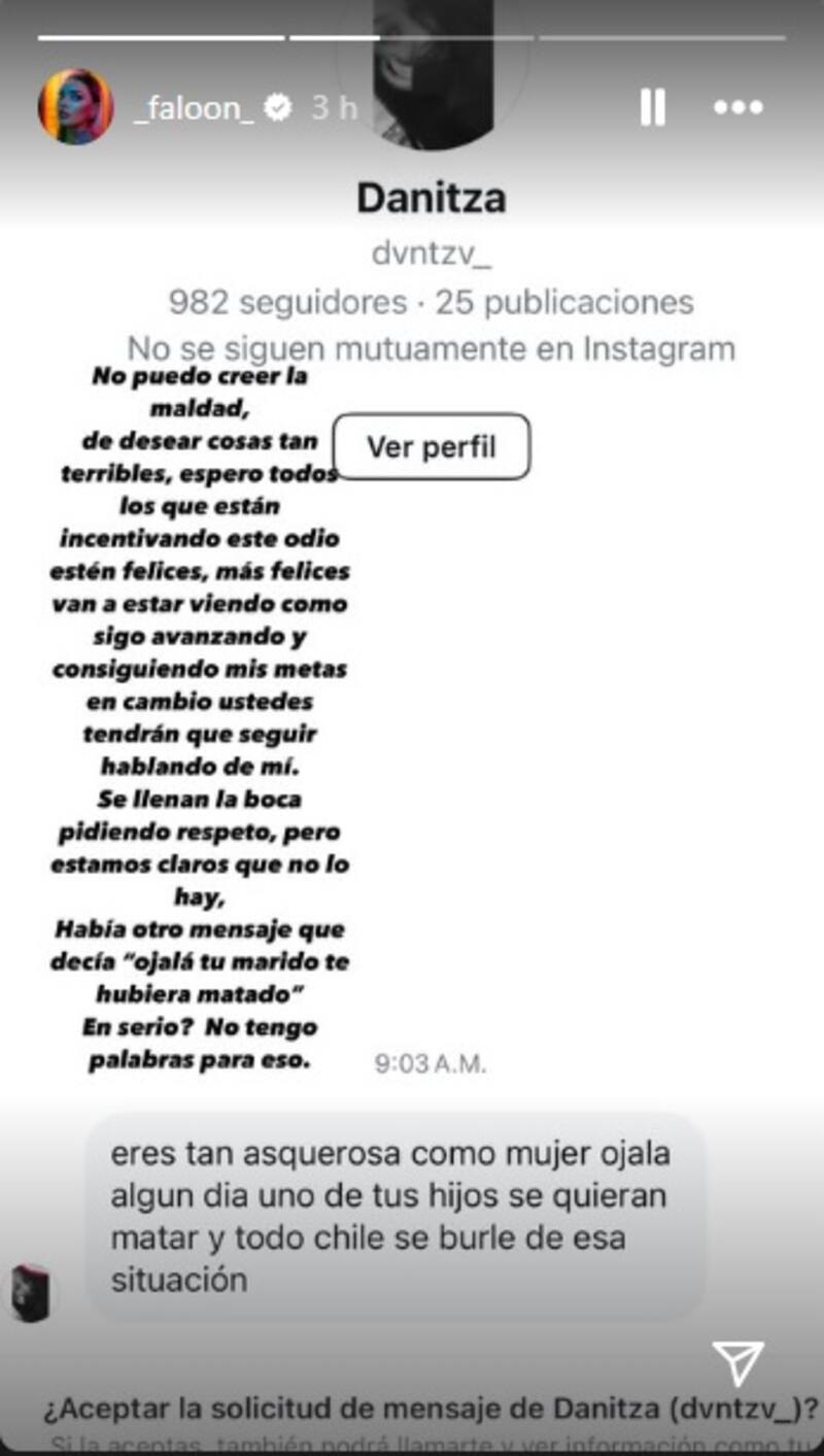 “Eres tan asquerosa como mujer, ojalá algún día uno de tus hijos se quieran matar y todo Chile se burle de esa situación”, le escribió la usuaria a Faloon.