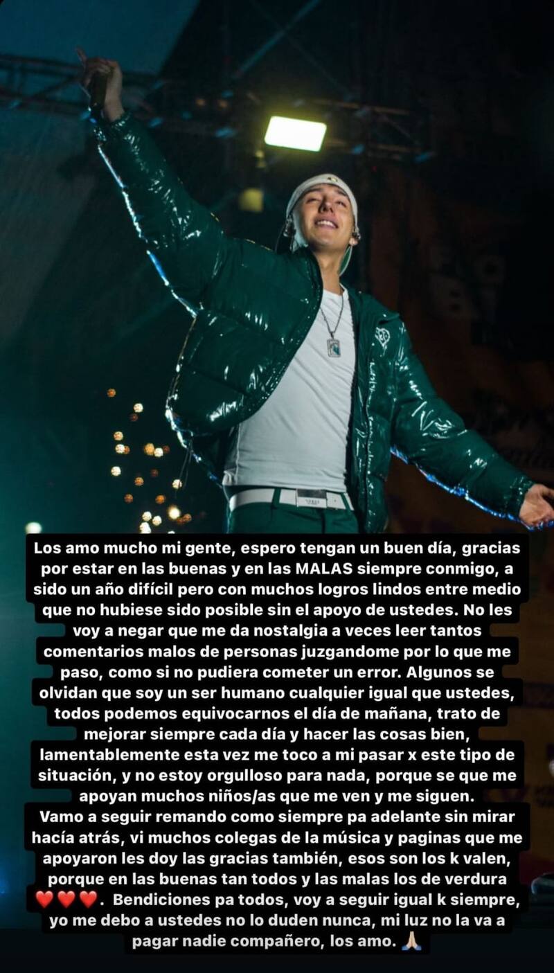 “No les voy a negar que me da nostalgia a veces leer tantos comentarios malos, de personas juzgándome por lo que me pasó, como si no pudiera cometer un error. Algunos se olvidan que soy un ser humano cualquiera, igual que ustedes, todos podemos equivocarnos el día de mañana“, descargó Carlos Rain Pailacheo, nombre real del cantante, en sus historias de Instagram.