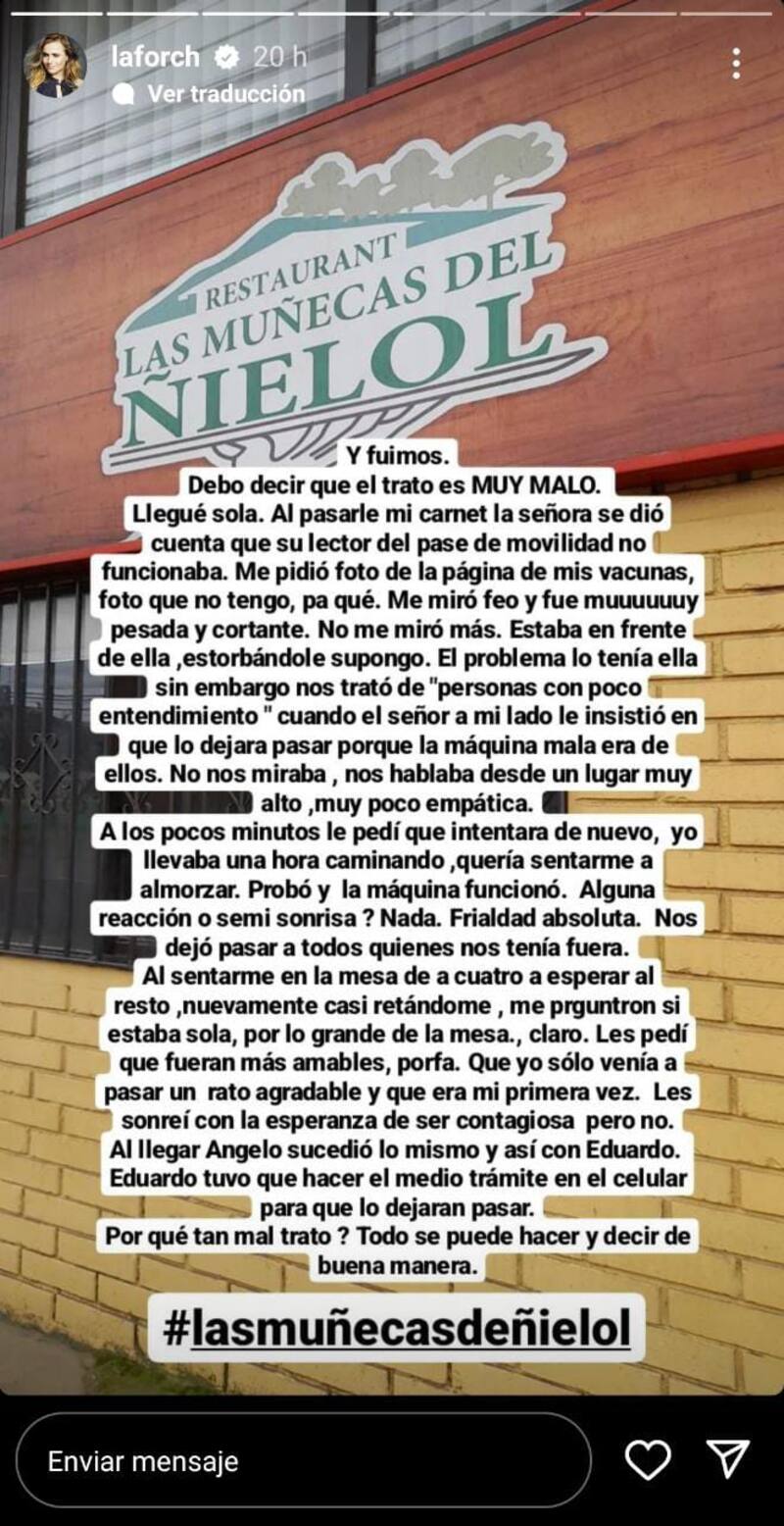 A través de sus historias de Instagram la cantante y actriz publicó fotos de un local de comida donde acudió en su viaje por la Región de la Araucanía, dando detalles del confuso momento que experimentó tras recibir malos tratos de parte de los trabajadores.