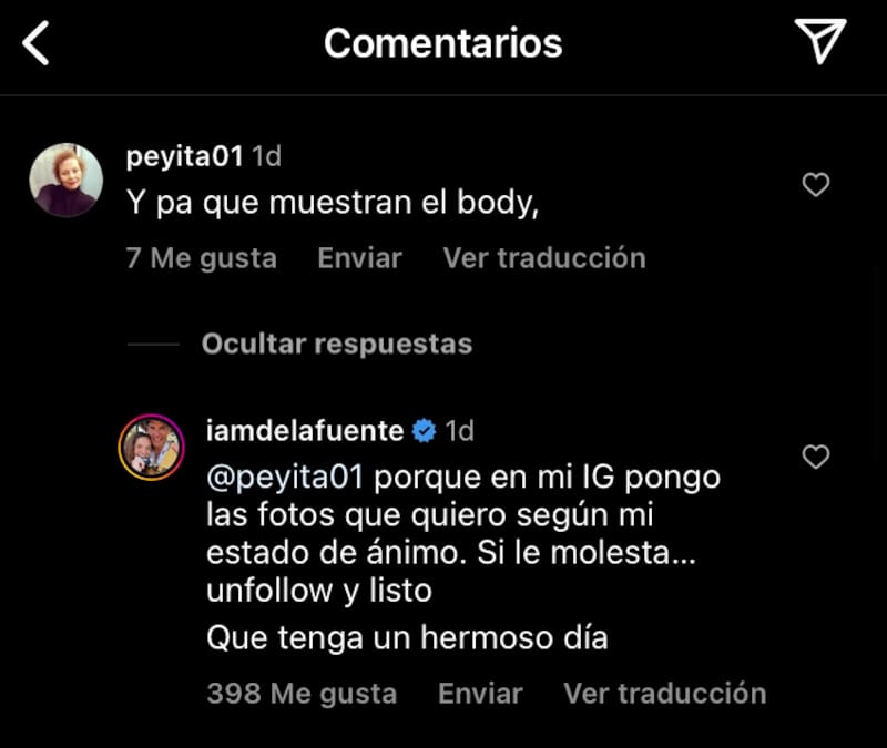 “Y pa’ que muestran el body”, escribió una seguidora. “Porque en mi IG pongo las fotos que quiero según mi estado de ánimo. Si le molesta… unfollow y listo”, contestó Cristián.