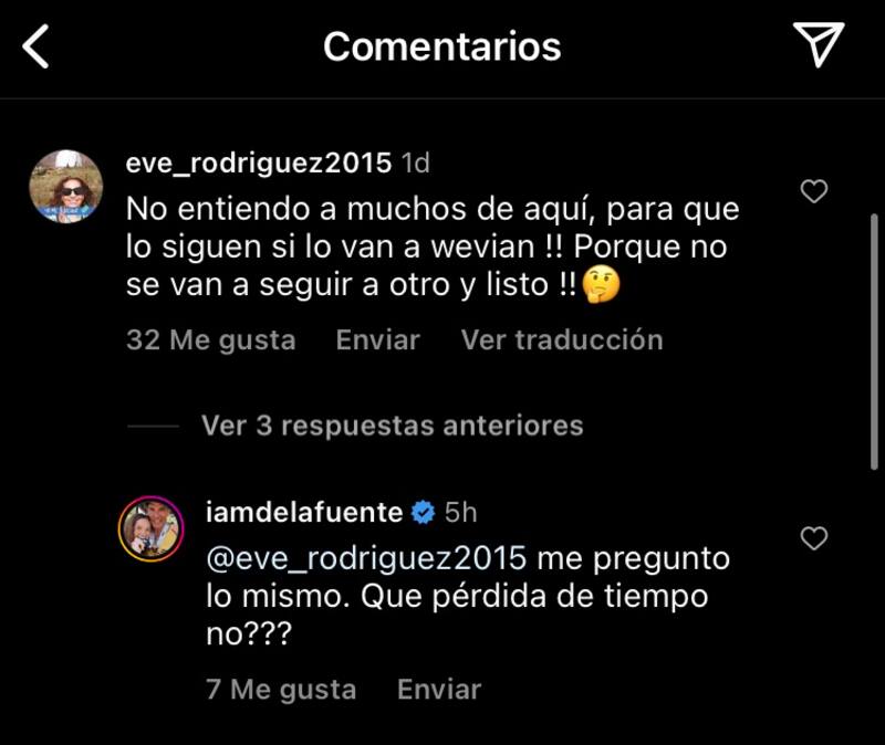 Por otro lado, también salieron algunos seguidores a defender a De la Fuente por las críticas que estaba recibiendo. “No entiendo a muchos aquí, para qué lo siguen si lo van web… por qué no se van a seguir a otro y listo”, cuestionó una usuaria.