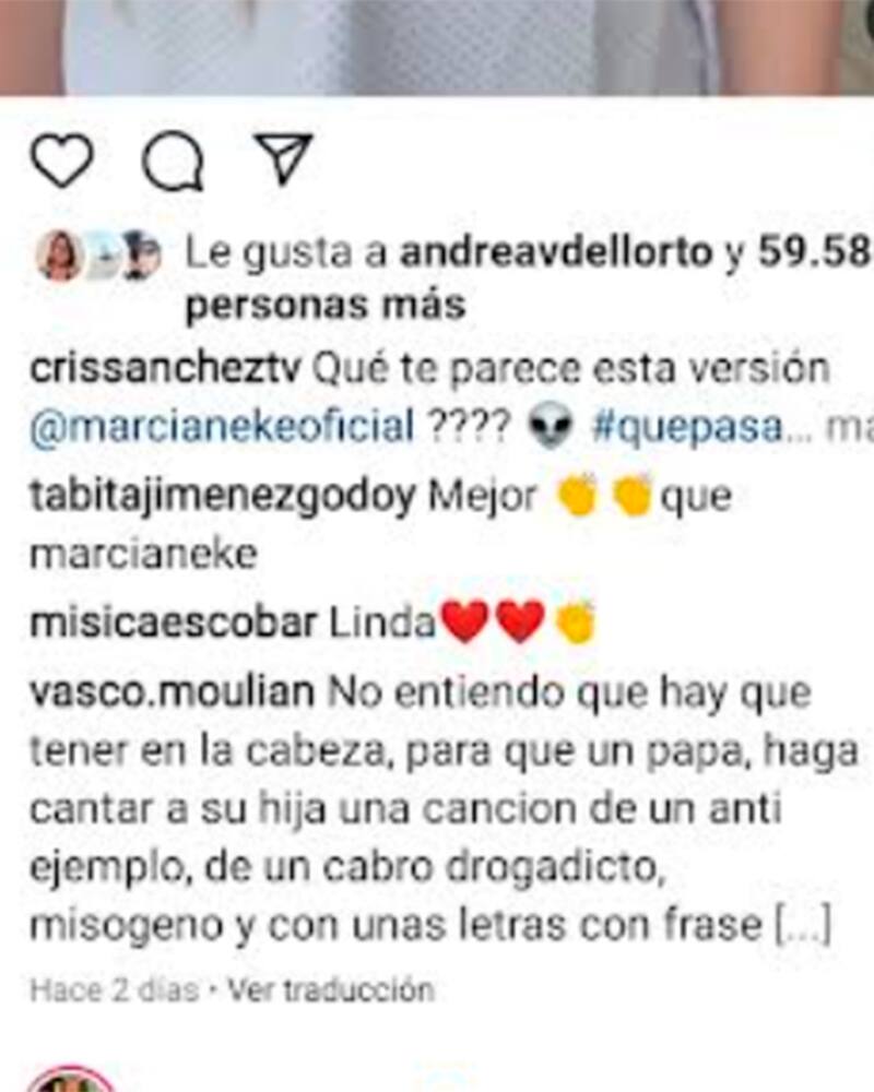 “No entiendo que hay que tener en la cabeza, para que un papá haga cantar a su hija una canción de un anti ejemplo, de un cabro drogadicto, misógino y con unas letras con frases…”, escribió, eliminando posteriormente el comentario.
