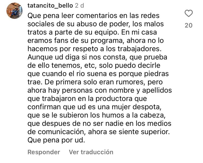 Y en esa misma línea, agregó: “Solo puedo decir que cuando el río suena es porque piedras trae. De primera eran rumores, pero ahora hay personas con nombre y apellido que trabajaron en la productora que confirman que usted es una mujer déspota, que se le subieron los humos a la cabeza, que después de no ser nadie en los medios de comunicación, ahora se siente superior. Qué pena por usted”.