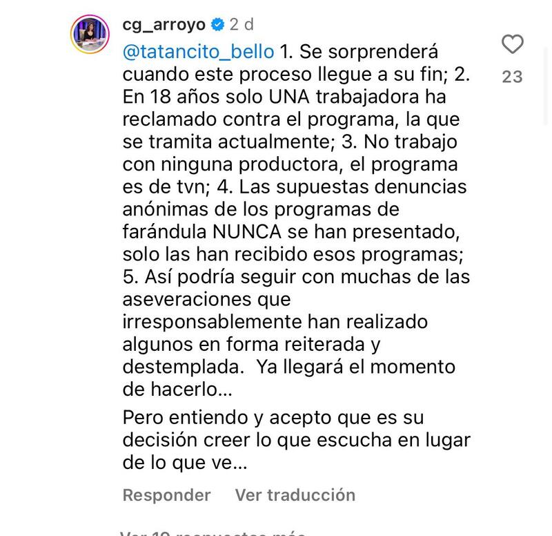 “1, se sorprenderá cuando este proceso llegue a su fin. En 18 años solo una trabajadora ha reclamado contra el programa, la que se tramita actualmente. 2, no trabajo con ninguna productora, el programa es de TVN. 3, las supuestas denuncias anónimas de los programas de farándula nunca se han presentado, solo las han recibido esos programas y 5, así podría seguir con muchas de las aseveraciones que irresponsablemente han realizado algunos en forma reiterada y destemplada. Ya llegará el momento de hacerlo… Pero entiendo y acepto que es su decisión creer lo que escucha en lugar de lo que ve”.