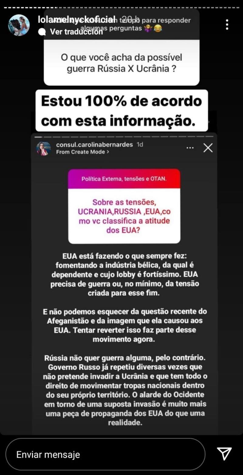 ¿Qué piensa Lola Melnick del eventual conflicto entre Rusia y Ucrania?