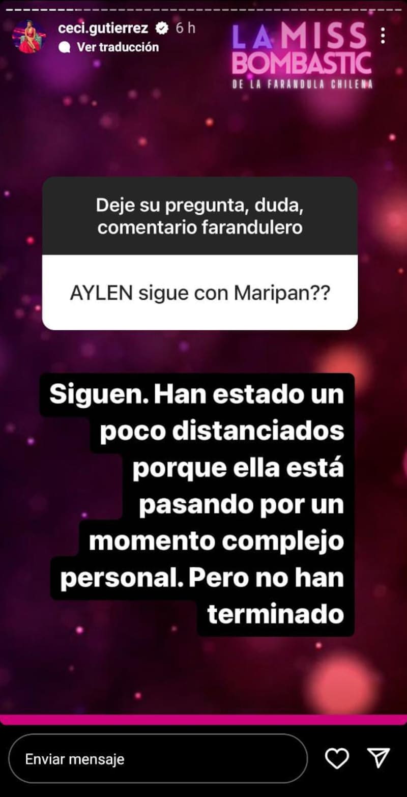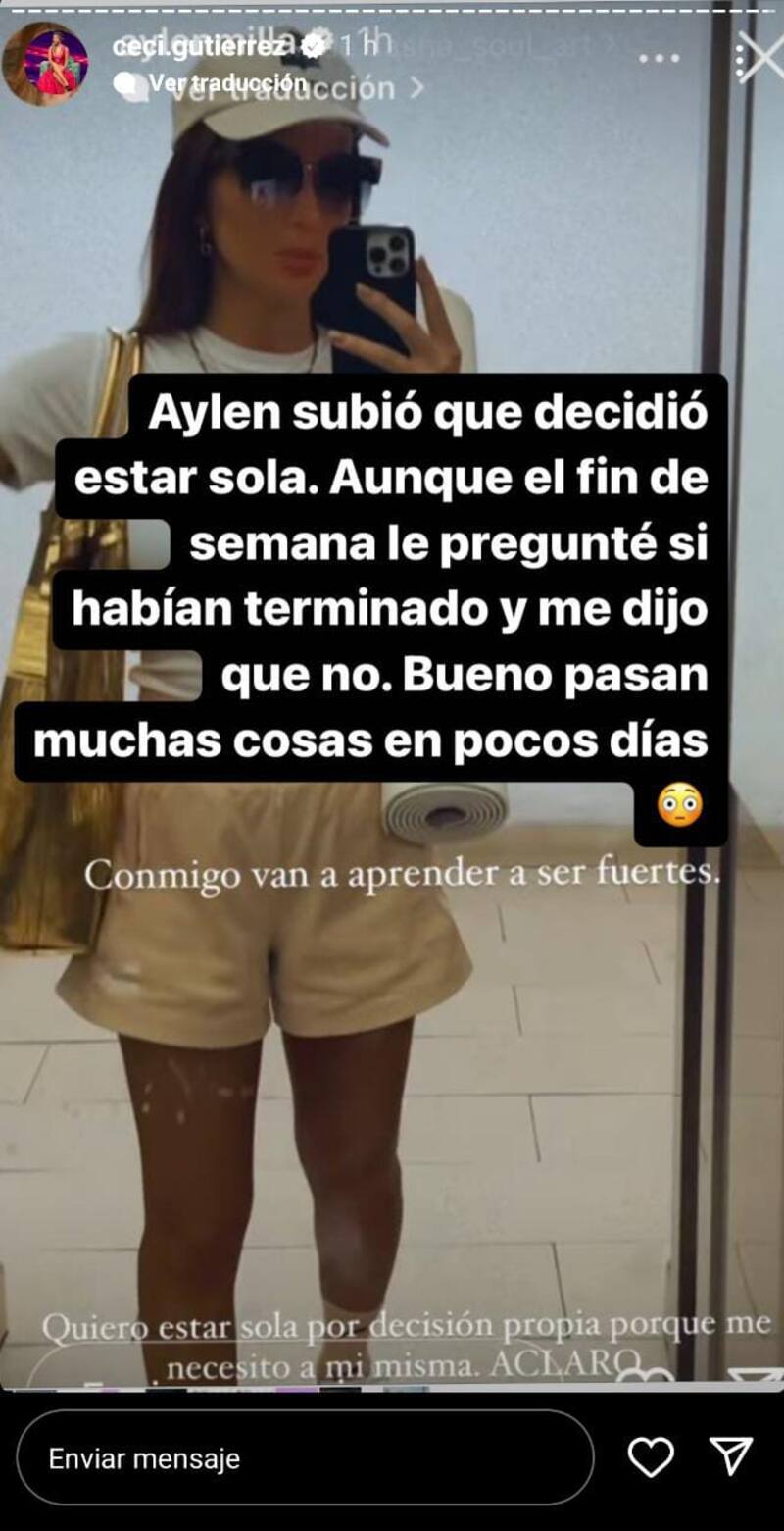 “Aylén subió que decidió estar sola. Aunque el fin de semana le pregunté si habían terminado y me dijo que no. Bueno pasan muchas cosas en pocos días”, agregó Cecilia Gutiérrez sumándose a las dudas sobre la continuidad del romance entre Aylén Milla y Guillermo Maripán.