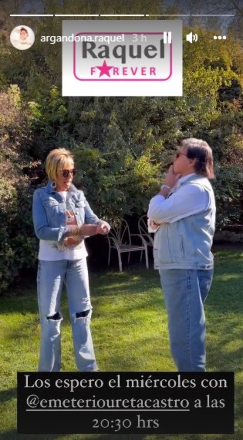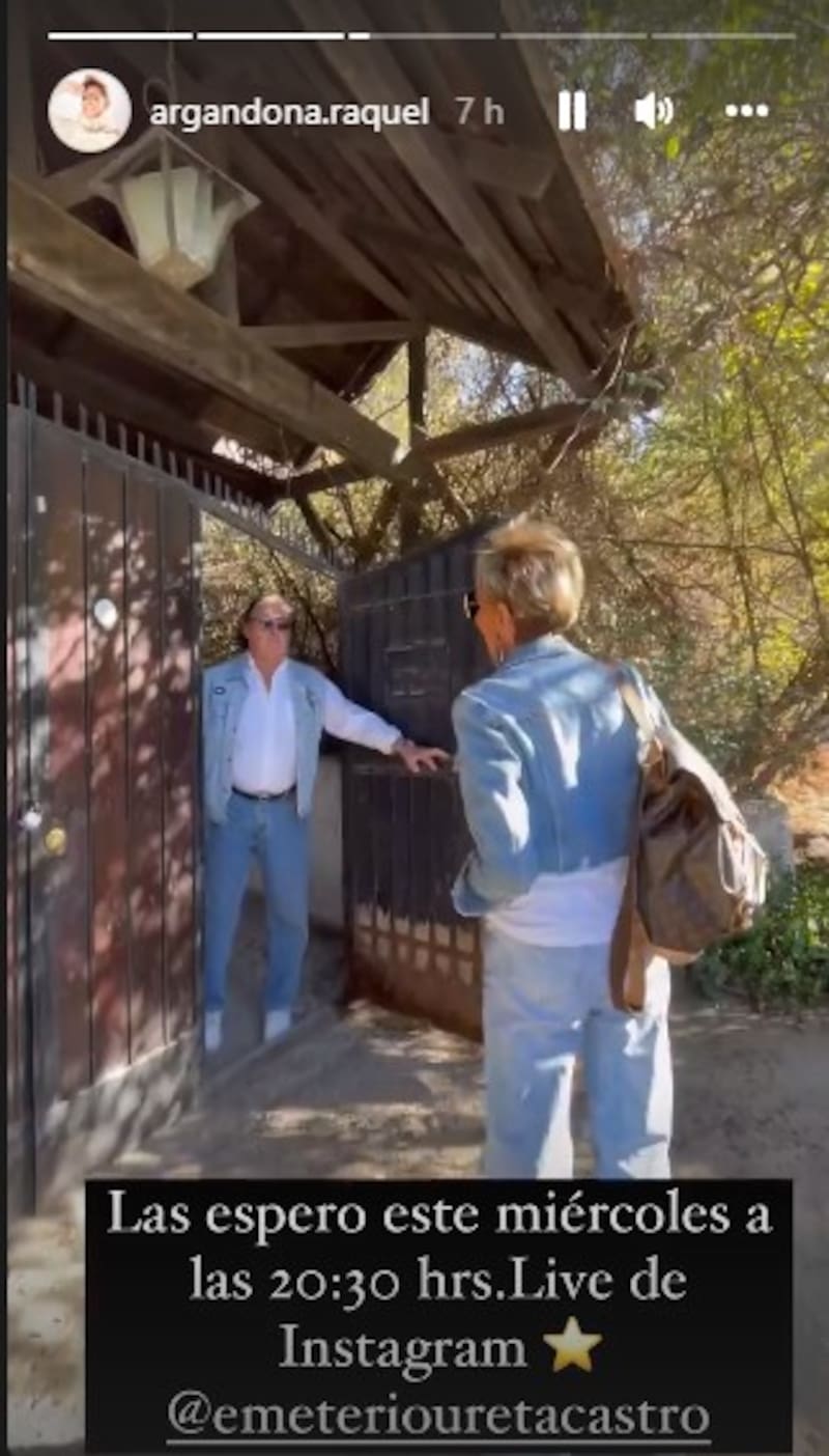 “Quise venir personalmente a invitarte para el próximo miércoles a las 20:30 horas porque quiero que seas mi segundo invitado en mi programa Raquel Forever”, señaló Argandoña en la puerta de la vivienda del empresario Emeterio Ureta con quien abordará diversos temas.